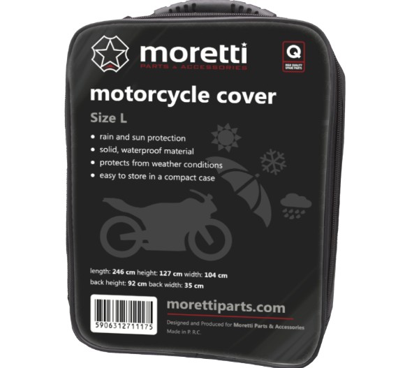 Wysokiej jakości pokrowiec firmy MORETTI wykonany z bardzo trwałego i odpornego na wszelkie czynniki atmosferyczne materiału. W komplecie etui na pokrowiec. Wykonany w taki sposób, że bez problemu możemy zasłonić cały motocykl
